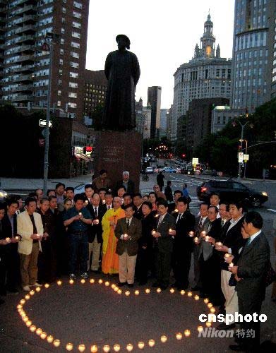 美東華人社團(tuán)聯(lián)合總會于十三日晚八點在紐約曼哈頓中國城的林則徐廣場發(fā)起了美東華人燭光祭奠中國地震災(zāi)區(qū)死難同胞的紀(jì)念活動,華聯(lián)總會下屬的多個僑團(tuán)都派代表出席,大家共同祈禱祝福幸存的災(zāi)區(qū)同胞平安度過難關(guān)。圖為活動現(xiàn)場。中新社發(fā) 鄧悅 攝