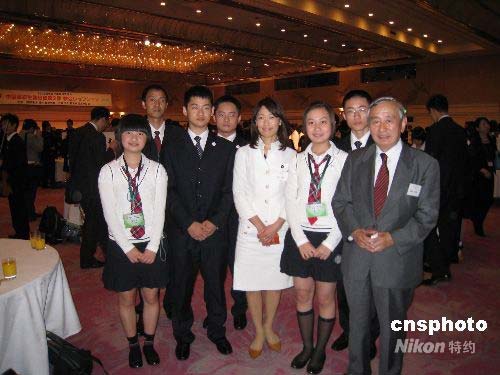 5月14日晚,由日本財團法人日中友好會館、社團法人日中友好協(xié)會主辦的歡迎中國高中生400人訪問團酒會在東京舉行。作為2008年“二十一世紀東亞青少年大交流計劃”的第二批,他們將參加與日中關系相關的研討會,走進日本高中課堂,在日本高中學生家庭住宿外,還將進行文化、經(jīng)濟、社會等方面的考察。圖為出席酒會的四川高中生和日中友好會館谷野作太郎副會長合影。中新社發(fā) 段躍中 攝