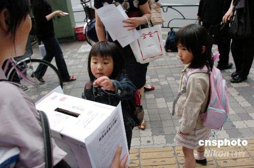 5月18日,一位日本小朋友為四川大地震災(zāi)區(qū)捐款。當(dāng)日,日本僑報社創(chuàng)辦的星期日漢語角舉行第40次交流會,主題為“向四川震區(qū)人民獻愛心”募捐和義賣活動。漢語角參加者來到繁華的池袋車站進行街頭募捐,全力支援中國抗震救災(zāi)。中新社發(fā) 段躍中 攝
