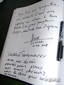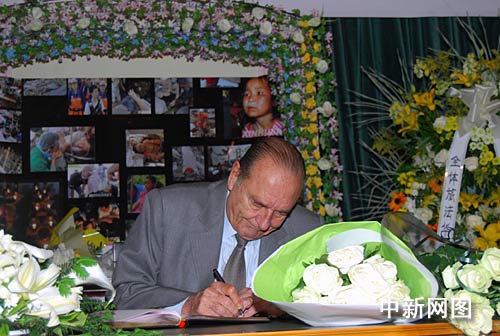 巴黎時(shí)間二十一日上午,法國前總統(tǒng)希拉克專程來到中國駐法國大使館,向中國汶川地震的遇難者表示深切哀悼。希拉克在吊唁簿上寫道:“對中國遇難者及他們的家屬表示深切的哀悼和慰問,對偉大的中國人民在此次抗震救災(zāi)中的表現(xiàn)表示欽佩。” 作者:吳衛(wèi)中