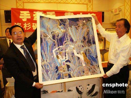 5月27日,著名旅美云南重彩畫(huà)家丁紹光捐出自己6幅畫(huà)作,參加洛杉磯66位畫(huà)家及書(shū)法家“手牽手、畫(huà)中情”共同為四川大地震捐畫(huà)賑災(zāi)義賣活動(dòng)。當(dāng)天,丁紹光的5幅云南重彩畫(huà)即被高價(jià)拍賣,這次義賣所有款項(xiàng)將交中領(lǐng)館轉(zhuǎn)四川災(zāi)區(qū)。圖為丁紹光(右)展示義賣畫(huà)作,左為南加州華人團(tuán)體聯(lián)合總會(huì)會(huì)長(zhǎng)程遠(yuǎn)。中新社發(fā) 盧威 攝
