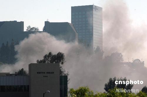 當?shù)貢r間六月一日凌晨四時四十五分,好萊塢環(huán)球影城發(fā)生大火,一名消防員和一名警察受輕傷。一個攝影棚被焚毀,每天接待世界各地游客的環(huán)球影城主題公園“金剛”景點被燒,《騙中騙》、《回到未來》和《冒牌天神》等影片的部分外景設(shè)施也毀于大火,經(jīng)濟損失估計達數(shù)千萬美元。不過環(huán)球片場總裁雷恩·梅耶稱,珍貴電影膠片和素材存儲在火場數(shù)百碼以外的一個地下室,因而幸免。圖為當天下午大火仍未撲滅。中新社發(fā) 張煒 攝