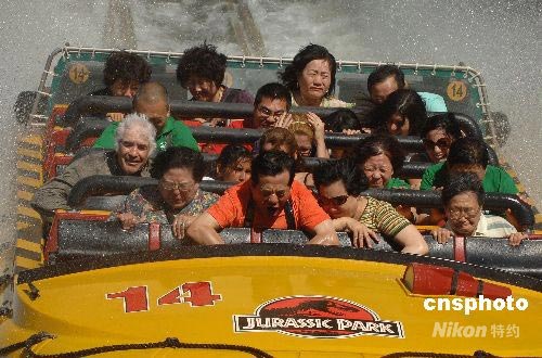 當(dāng)?shù)貢r(shí)間六月十八日,來自北京的旅游團(tuán)成員在好萊塢“侏羅紀(jì)公園”享受驚險(xiǎn)刺激。該旅游團(tuán)于十七日晚抵達(dá)洛杉磯,他們是美國向中國旅游團(tuán)正式開放后抵達(dá)洛杉磯的首批中國內(nèi)地游客,共有七十多人,以中老年人為主。他們將在美國東西海岸主要旅游城市停留十二天至十三天,每位游客的團(tuán)費(fèi)約兩萬元人民幣。中新社發(fā) 張煒 攝