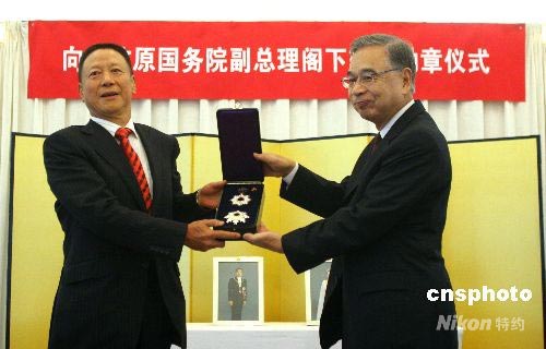6月30日,日本授予中國前國務院副總理谷牧(本名劉家語)先生旭日大勛章。谷牧也是第二位被授予這一榮譽的中國人。圖為日本國駐華大使宮本雄二(右)向谷牧先生長子贈送勛章。谷牧先生本人因身體原因未能出席本次授勛儀式。中新社發(fā) 富田 攝