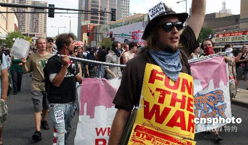 來自全美各地的數(shù)千名反戰(zhàn)人士一日在位于明尼蘇達(dá)州首府圣保羅的共和黨全國代表大會(huì)會(huì)場外示威,反對(duì)即將獲得共和黨總統(tǒng)候選人提名的亞利桑那州國會(huì)參議員麥凱恩支持布什政府的伊拉克政策。中新社發(fā) 李靜 攝