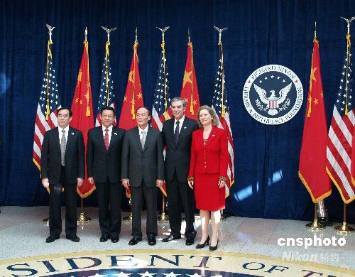 當(dāng)?shù)貢r(shí)間9月16日,中美商貿(mào)聯(lián)合委員會(huì)第19次會(huì)議在美國(guó)加利福尼亞州尼克松圖書館舉行,美國(guó)商務(wù)部長(zhǎng)古鐵雷斯(左4)和貿(mào)易代表施瓦布(左5)在迎賓廳歡迎中國(guó)國(guó)務(wù)院副總理王岐山(左3)、中國(guó)商務(wù)部長(zhǎng)陳德銘(左2)、中國(guó)海關(guān)總署署長(zhǎng)盛光祖(左1)。中新社發(fā) 盧威 攝