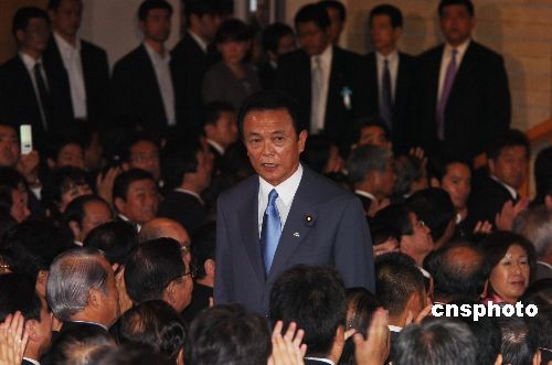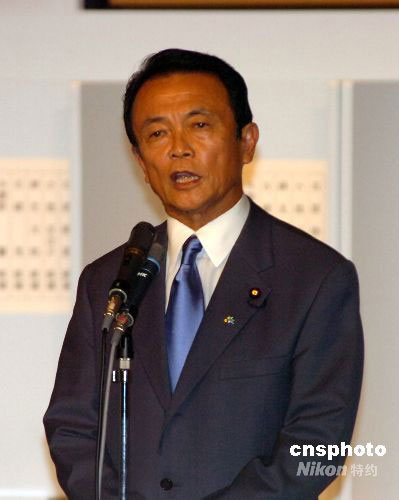 圖為當(dāng)選的麻生太郎在選舉現(xiàn)場(chǎng)發(fā)表演說(shuō)。