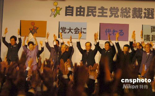 圖為選舉結(jié)束后,前總裁福田康夫及眾候選人在該黨參議院議員會長尾辻帶領(lǐng)下與現(xiàn)場黨員一起三呼萬歲。