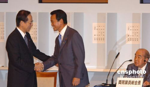 圖為前總裁、現(xiàn)任首相福田康夫向新當(dāng)選的麻生太郎表示祝賀。
