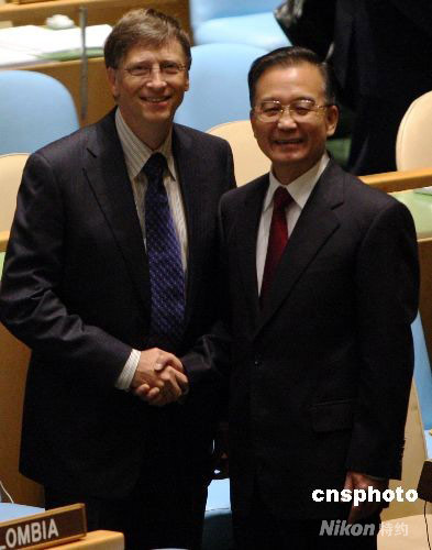 25日,中國總理溫家寶出席聯(lián)合國千年發(fā)展目標高級別會議時與前微軟總裁比爾·蓋茨進行短暫交談。中新社發(fā) 李靜 攝