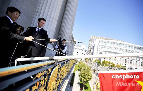 當(dāng)?shù)貢r(shí)間九月二十九日中午,舊金山市長紐森(左二)和中國駐舊金山總領(lǐng)事高占生(左一),共同在市政府升起五星紅旗,慶祝中華人民共和國成立五十九周年。這是舊金山市第十三年為中國國慶升旗。同日,市長紐森宣布十月一日為“中國國慶日”和“華裔傳統(tǒng)日”。中新社發(fā) 陳鋼 攝