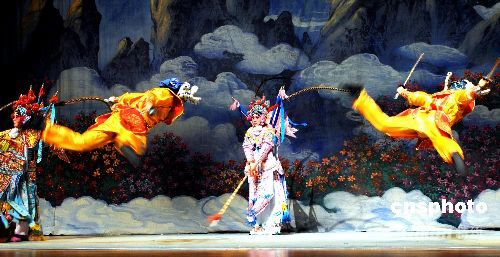 齊淑芳京劇團(tuán)在“世界舞臺系列”演出。今年是齊淑芳京劇團(tuán)在美國成立20周年,應(yīng)紐約大學(xué)SKIRBALL中心的邀請,10月5日,該團(tuán)以《楊門女將》參加由十個國家輪流表演的“世界舞臺系列”中演出,為讓不懂漢語的觀眾看懂京劇《楊門女將》,齊淑芳京劇團(tuán)在百老匯演出的腳本上作了重大修改,減少唱段,增加武打,使文戲動聽,武打精彩,劇情緊湊。中新社發(fā) 龔文謨 攝