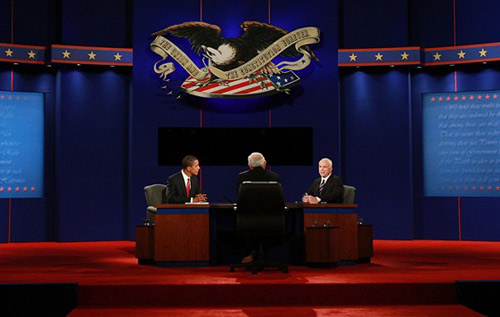美國(guó)共和黨總統(tǒng)候選人麥凱恩和民主黨總統(tǒng)候選人奧巴馬于美東時(shí)間15日晚上9時(shí)(北京時(shí)間16日早上9時(shí))在紐約霍夫斯特拉大學(xué)展開(kāi)總統(tǒng)選舉投票前的最后一場(chǎng)電視辯論。雙方坐在同一張桌子前就各自的經(jīng)濟(jì)計(jì)劃展開(kāi)唇槍舌戰(zhàn)。