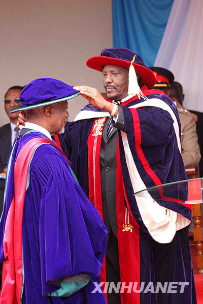 10月17日,在肯尼亞首都內羅畢,內羅畢大學副校長喬治·馬果哈(左三)為聯(lián)合國前秘書長科菲·安南(左二)穿上博士服。新華社發(fā)(湯姆·尼亞莫基攝)