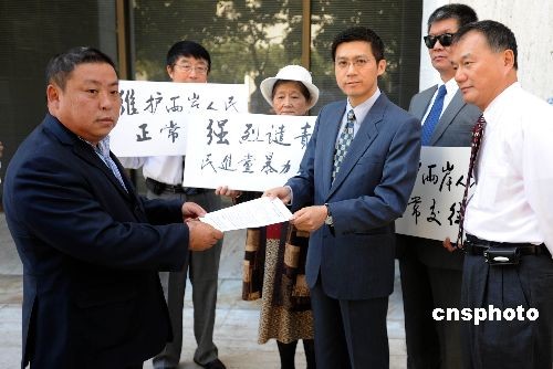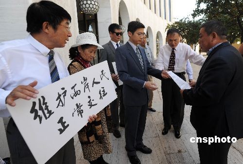 當?shù)貢r間十月二十二日,南加州中國和平統(tǒng)一促進會聯(lián)盟主席周德昭將一封抗議信交付“駐洛杉磯臺北經(jīng)濟文化辦事處”代表楊光彬。這份由當?shù)囟鄠華人社團聯(lián)名的抗議信稱,大陸海協(xié)會副會長張銘清在臺南遭民進黨極端分子暴力攻擊事件震驚海外華人社會,華人社團嚴厲譴責極端分子的野蠻暴力行徑,強烈要求馬英九政府嚴懲肇事者。中新社發(fā) 張煒 攝