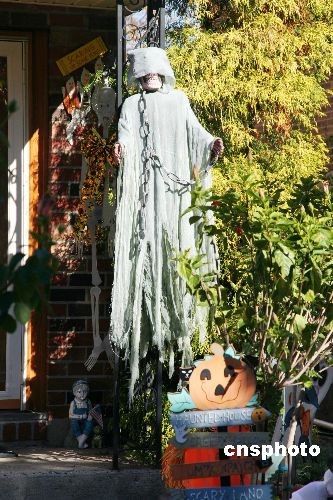 十月三十一日是一年一度的萬圣節(jié),紐約的許多居民都樂意花不多的銀子,把自己家裝飾得“鬼影憧憧”,以度過一個(gè)快樂節(jié)日。中新社發(fā) 魏晞 攝