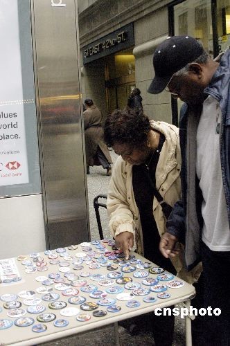11月3日,美國大選前一天,民眾在紐約街頭購買印有總統(tǒng)候選人頭像的胸章。中新社發(fā) 魏晞 攝