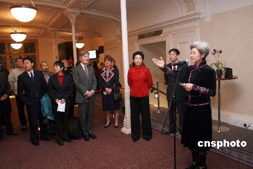 當(dāng)?shù)貢r(shí)間8日晚,內(nèi)蒙古民族歌舞劇院蒙古族青年合唱團(tuán)在倫敦卡杜甘音樂(lè)廳(Cadogan Hall)進(jìn)行無(wú)伴奏合唱演出。圖為演出前的招待會(huì)上,蒙古族的中國(guó)駐英大使傅瑩(右一)換上民族服裝,在致辭中歡迎來(lái)自家鄉(xiāng)的合唱團(tuán)的演出。中新社發(fā) 李鵬 攝