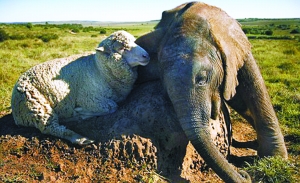 她說,泰姆巴(對艾伯特)充滿好奇,它用鼻子輕觸艾伯特的后背,且俯身嗅那羊毛的氣息。自此,泰姆巴與艾伯特難舍難分,它們在一起時,綿羊喜歡將頭部靠在小象的背部。