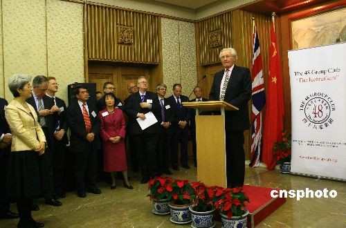 當?shù)貢r間11月12日晚,中國駐英使館與英國48家集團俱樂部聯(lián)合舉辦一年一度的“破冰者”招待會,頒發(fā)今年的“破冰者獎”。圖為英國前副首相赫塞爾廷勛爵在致辭,左一為中國駐英大使傅瑩。中新社發(fā) 李鵬 攝