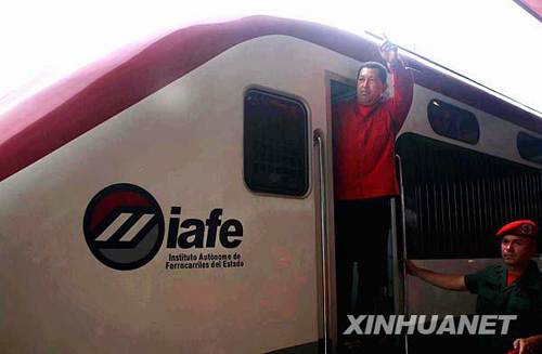 委內(nèi)瑞拉總統(tǒng)查韋斯站在一輛停放在亞拉圭州的中國(guó)制造動(dòng)車(chē)組駕駛室門(mén)口揮手。
