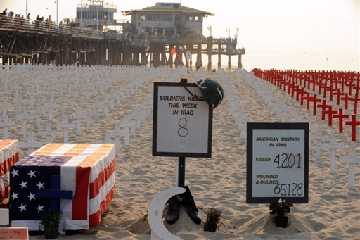 11月16日,美國(guó)加州,人們?yōu)橐翍?zhàn)中死難的美國(guó)士兵豎起的十字架。自2004年起的每個(gè)周日,幾乎都有新的十字架被豎起。