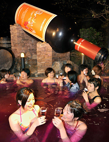 近日,一年一度的法國“博若萊”鮮葡萄酒開瓶日到來。由于時差原因,日本飲者得以先嘗為快,小涌園美酒溫泉浴活動也由此開始。在日本箱根的小涌園溫泉浴場,客人們泡在鮮葡萄酒溫泉中舉杯慶祝。