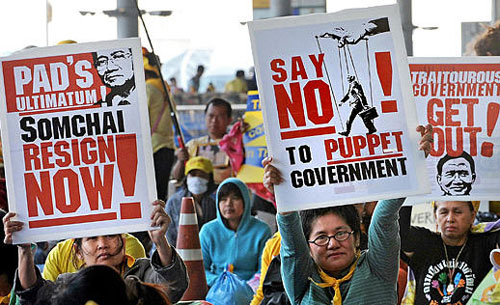 11月28日,泰國(guó)反政府的人民民主聯(lián)盟(民盟)支持者在曼谷素萬(wàn)那普國(guó)際機(jī)場(chǎng)內(nèi)繼續(xù)抗議。泰國(guó)總理頌猜27日晚在泰國(guó)北部城市清邁發(fā)表全國(guó)電視講話,宣布在曼谷素萬(wàn)那普國(guó)際機(jī)場(chǎng)和廊曼機(jī)場(chǎng)實(shí)施緊急狀態(tài)法。但是民盟支持者依舊占領(lǐng)著這兩個(gè)機(jī)場(chǎng)。