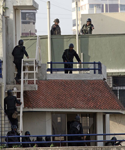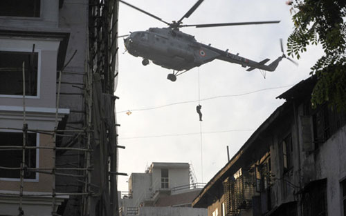 11月28日,在印度孟買,印度突擊隊(duì)員從武裝直升機(jī)上空降到納里曼大樓的樓頂。印度警方證實(shí),印度軍警已經(jīng)從孟買市內(nèi)猶太人聚居的納里曼大樓中解救出7名人質(zhì),其中包括2名外國(guó)人,但目前還有多名人質(zhì)在武裝分子手中。