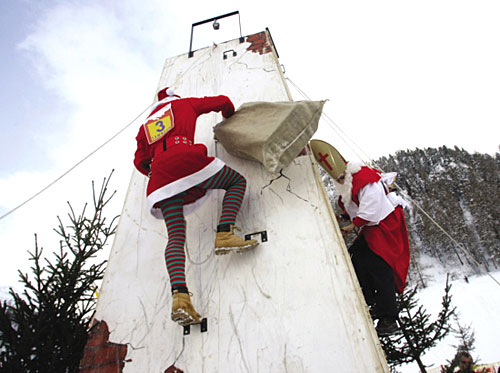 日前,瑞士阿爾卑斯山東部的一個(gè)村莊,一年一度的“圣誕老人全國錦標(biāo)賽”正在如火如荼地舉行著。來自世界各國的15支參賽隊(duì)伍紛紛使出渾身解數(shù)。這次的比賽項(xiàng)目包括了攀爬煙囪以及驢子競賽等。在比賽過程中,參賽者們必須打扮成圣誕老人的模樣,身上還要背個(gè)裝滿禮物的麻包袋。
