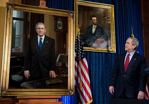 12月6日,美國總統(tǒng)布什在美國賓夕法尼亞州的費(fèi)城出席自己肖像畫的揭幕儀式。這幅肖像畫由馬克·卡德爾創(chuàng)作。