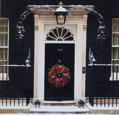 唐寧街10號(hào)的漂亮前門(mén)、臺(tái)階以及欄桿上的灰塵非常干燥,表明那些雪花應(yīng)該是假的。