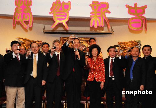 當?shù)貢r間1月16日晚,中國駐美大使周文重(前排中)和夫人謝淑敏女士(前右四)在華盛頓中國城,向來自海峽兩岸的大華府十八個最大僑社領(lǐng)袖以及大華府地區(qū)及廣大旅美僑胞祝賀牛年新春。圖為周大使夫婦和僑社領(lǐng)袖們向廣大僑胞敬酒賀新春。中新社發(fā) 邱江波 攝