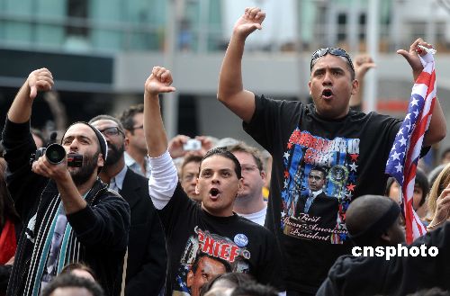 當(dāng)?shù)貢r(shí)間一月二十日清晨,兩千多名洛杉磯市民聚集在洛杉磯動感廣場(LA LIVE),通過大屏幕觀看美國第四十四任總統(tǒng)奧巴馬就職儀式。當(dāng)電視畫面出現(xiàn)卸任總統(tǒng)布什時(shí),人群中發(fā)出噓聲,一些奧巴馬支持者向布什表達(dá)不滿。
