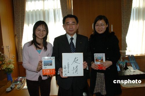 2月6日中午,日本文部科學(xué)大臣鹽谷立在東京大臣辦公室親切接見了第四屆中國(guó)人日語征文大賽主辦單位日本僑報(bào)社代表和兩名最優(yōu)秀獎(jiǎng)獲獎(jiǎng)?wù)摺本┐髮W(xué)日語系研究生徐蓓和湘潭大學(xué)青年教師張桐赫。鹽谷立大臣高度評(píng)價(jià)中國(guó)人日語征文大賽,為促進(jìn)日中兩國(guó)人民的相互理解起了積極的作用,勉勵(lì)獲獎(jiǎng)?wù)呃^續(xù)努力,為日中交流作出更大貢獻(xiàn)。鹽谷立為中國(guó)青少年題寫了“友情”二字,期待日中兩國(guó)青少年世代友好。圖為鹽谷立接受徐蓓和張桐赫贈(zèng)送獲獎(jiǎng)作品集《我認(rèn)識(shí)的日本人》。中新社發(fā) 段躍中 攝