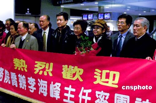 當?shù)貢r間二月十日,中國國務(wù)院僑辦主任李海峰率領(lǐng)“文化中國·四海同春”藝術(shù)團一行抵達舊金山,開始為期四天的藝術(shù)之旅,與當?shù)厝A人華僑共慶新春。中國駐舊金山總領(lǐng)事高占生、華商總會會長黃錫海及顧問池洪湖、魏需遜等僑界代表到機場迎接。 中新社發(fā) 陳鋼 攝