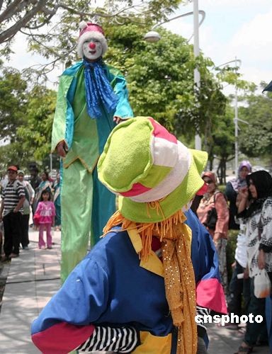 3月21日,馬來西亞首都吉隆坡新行政中心布城舉行熱氣球嘉年華活動(dòng),踩著高蹺的小丑進(jìn)行表演吸引當(dāng)?shù)孛癖。中新社發(fā) 趙勝玉 攝