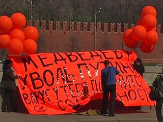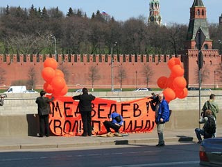 據(jù)俄羅斯新聞網(wǎng)報(bào)道,俄羅斯反對黨“團(tuán)結(jié)運(yùn)動”組織成員4月28日在克里姆林宮前舉行了聲勢浩大的反政府游行活動。期間,3名“團(tuán)結(jié)運(yùn)動”的積極分子在克里姆林宮附近的河岸邊懸掛紅色的巨型橫幅,上面印有:“梅德維杰夫,辭去普京總理職務(wù)。”字樣,橫幅兩邊系有紅色的氣球,橫幅下部印有“團(tuán)結(jié)運(yùn)動”組織的徽標(biāo)。
