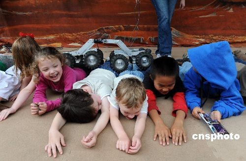 美國(guó)國(guó)家航空航天局(NASA)下屬的噴氣推進(jìn)實(shí)驗(yàn)室(JPL)當(dāng)?shù)貢r(shí)間五月二日對(duì)公眾開(kāi)放,當(dāng)?shù)財(cái)?shù)千民眾不懼潛在的“豬流感”威脅,參觀(guān)這座代表美國(guó)尖端航天科技的科研基地。圖為兒童體驗(yàn)月球車(chē)模型的爬坡技能。噴氣推進(jìn)實(shí)驗(yàn)室位于洛杉磯附近的帕薩迪納市,目前主要從事太陽(yáng)系行星探測(cè)任務(wù)等。中新社發(fā) 張煒 攝