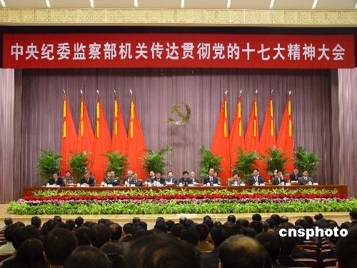 十月二十四日上午,新任中共中央政治局常委、中央紀委書記賀國強出現(xiàn)在中紀委機關(guān)大禮堂,與中央紀委監(jiān)察部機關(guān)的黨員干部見面。中共中央紀委監(jiān)察部當日召開機關(guān)全體黨員干部大會,傳達學習黨的第十七次全國代表大會精神,賀國強出席會議并講話。中新社發(fā) 孫宇挺 攝