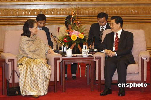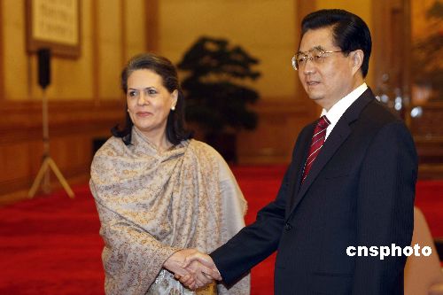 十月二十六日,中國國家主席胡錦濤在北京人民大會堂會見來訪的印度國大黨主席索尼婭·甘地。中新社發(fā) 盛佳鵬 攝