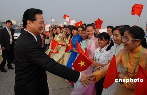 十月二十七日下午,越南總理阮晉勇飛抵廣西南寧市,出席十月二十八日開(kāi)幕的第四屆中國(guó)—東盟博覽會(huì)。在南寧國(guó)際機(jī)場(chǎng),阮晉勇與迎候在停機(jī)坪上的越南留學(xué)生親切握手。中新社發(fā) 蔣雪林 攝