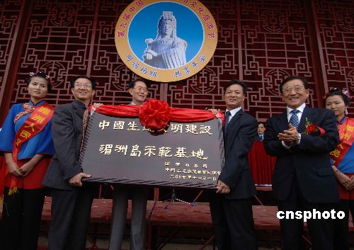 11月1日,中共中央委員、國家林業(yè)局局長賈治邦(右二)、中國生態(tài)道德教育促進(jìn)會理事長陳壽朋(左三)在第九屆中國.湄州媽祖文化旅游節(jié)開幕式上共同為中國第一個生態(tài)文明建設(shè)示范基地——福建莆田湄洲島基地授牌。當(dāng)天,媽祖故鄉(xiāng)福建莆田湄洲島成立了中國第一個生態(tài)文明建設(shè)示范基地。中新社發(fā) 劉可耕 攝