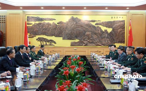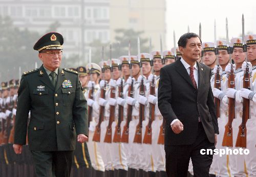 十一月七日,中華人民共和國(guó)中央軍委副主席、國(guó)務(wù)委員兼國(guó)防部長(zhǎng)曹剛川在北京舉行儀式歡迎印度尼西亞國(guó)防部長(zhǎng)尤沃諾·蘇達(dá)爾索諾,隨后雙方舉行了會(huì)談。中新社發(fā) 廖文靜 攝