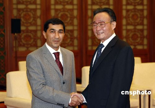 十一月二十三日,全國(guó)人大常委會(huì)委員長(zhǎng)吳邦國(guó)在北京人民大會(huì)堂會(huì)見(jiàn)來(lái)訪的烏茲別克斯坦最高會(huì)議立法院副主席沙特莫諾夫。中新社發(fā) 盛佳鵬 攝