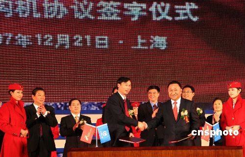 十二月二十一日下午,由中國航空工業(yè)第一集團(tuán)公司(中國一航)自行研制生產(chǎn)的中國首架自主知識(shí)產(chǎn)權(quán)噴氣支線客機(jī)ARJ21-700飛機(jī),在上海飛機(jī)制造廠舉行盛大的總裝下線儀式。圖為中國一航總經(jīng)理助理、中國一商用飛機(jī)有限公司總經(jīng)理羅榮懷(左四)與深圳航空公司總裁、鯤鵬航空董事長李昆在儀式上簽署ARJ21飛機(jī)訂購協(xié)議,后者將購買ARJ21飛機(jī)一百架,至此,該飛機(jī)已獲訂單一百七十一架。中新社發(fā) 孫自法 攝