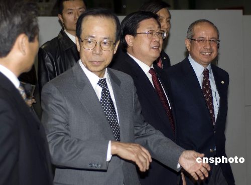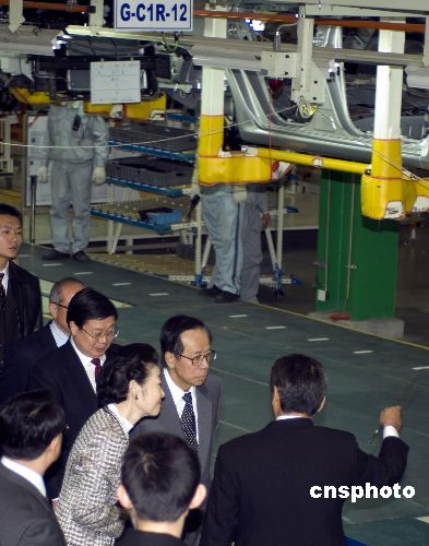 應(yīng)邀訪華的日本首相福田康夫(左二)在天津市代理市長黃興國(右二)的陪同下,前往位于天津?yàn)I海新區(qū)的天津一汽豐田有限公司參觀訪問。