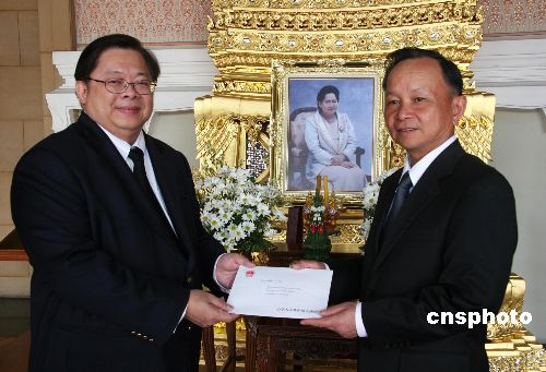 一月三日,中國國家主席胡錦濤向泰國國王普密蓬發(fā)來唁電,對(duì)泰國王姐甘拉亞妮·瓦塔娜逝世表示哀悼。當(dāng)日上午,中國駐泰大使張九桓(右)通過泰國外交部轉(zhuǎn)交這份唁電。中新社發(fā) 顧時(shí)宏 攝