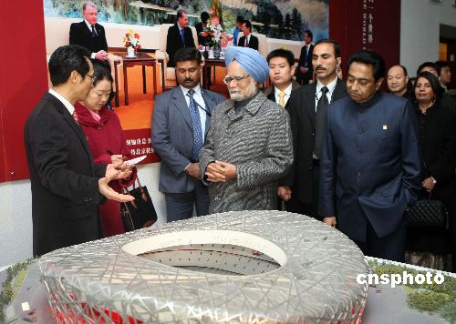 1月13日,印度總理辛格來到北京市“2008”工程展示中心,參觀2008年北京奧運會場館建設(shè)。這是辛格擔(dān)任印度總理以來首次訪問中國,也是時隔五年后印度總理再次來訪。中新社發(fā) 盛佳鵬 攝