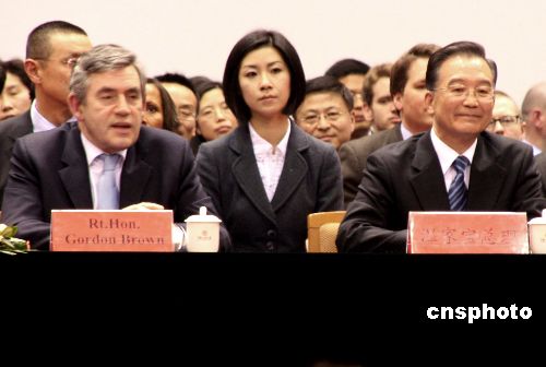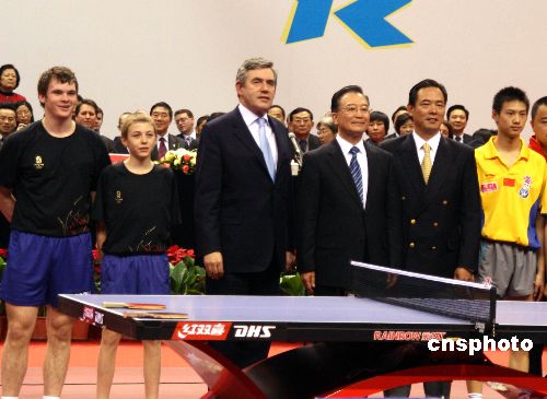 十八日下午,中國(guó)總理溫家寶與來(lái)華訪問(wèn)的英國(guó)首相布朗,在中國(guó)人民大學(xué)“世紀(jì)館”觀看中英乒乓球友誼賽,并與運(yùn)動(dòng)員進(jìn)行了交流。中新社發(fā) 周兆軍 攝